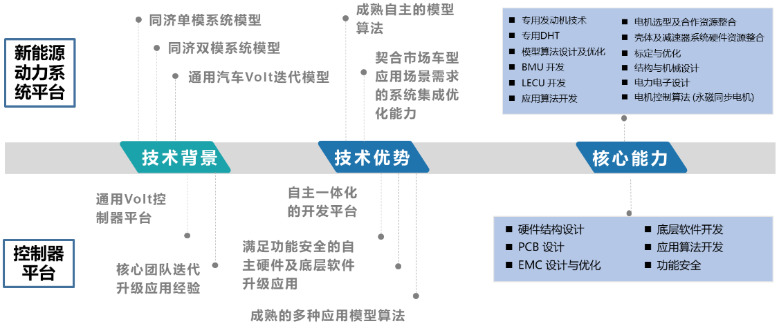 经过十多年的技术积累和磨练,济铃公司团队完成了车规级控制器硬件平台化、底层软件平台化,拥有100%的软硬件自主知识产权;自主开发的一体化应用开发环境可以帮助控制应用开发者非常迅速(3个月内)从一个CPU平台切换到另外一个CPU平台,大大缩短产品基础计算平台的切换时间;同时,具备优秀的混合动力系统集成及功能安全设计能力。济铃公司以电控系统为核心技术,布局增程器平台、控制器平台等产品业务平台,目前已拥有汽油30kW、柴油60kW等增程器平台产品以及HCU、VCU、车载储能系统等控制器平台产品。